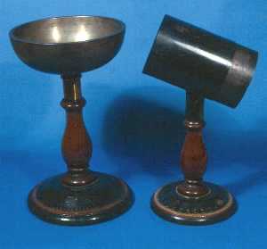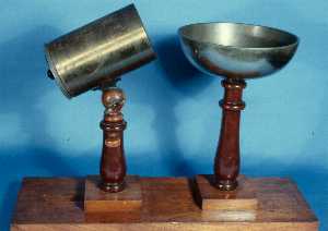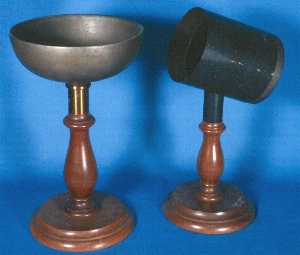 The edge of the cup or bell of Savart's apparatus is set into oscillation with a violin bow to produce a sound of definite pitch. The sliding piston of the resonator is then moved in and out to give the maximum amplitude of sound. Note that the relatively large diameter of the resonator gives large end corrections; the wavelength of the resonant wavelength is larger than four times the interior depth.