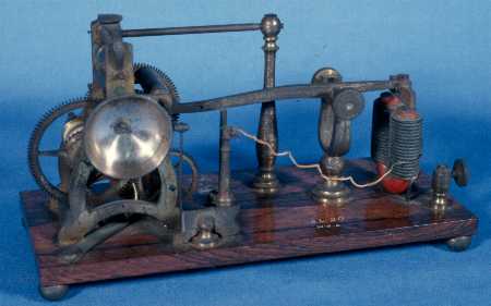 The mechanical and electrical design are pure Davis, with the bell to show that rotation was taking place as the iron bar was alternately attracted to the vertical electromagnet and then released. The instrument is in the collection of Wesleyan University in Middletown, Connecticut. |