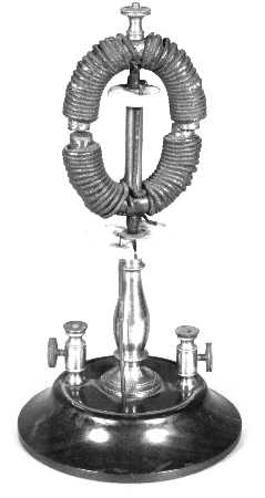 In this instrument there are two semicircular electro-magnets of the same size, both of which have freedom of motion. The lower semicircle is supported by a pivot entering the upright pillar below it; its own axis is hollowed to receive the pivot on which the upper semicircle revolves. The two white disks are commutators furnishing alternating connections to the two electromagnets. When the apparatus is connected to a battery, the two coils will spin in opposite directions. This instrument, which cost $6.00 when new, is in the Collection of Historical Scientific Instruments at Harvard University. |