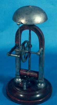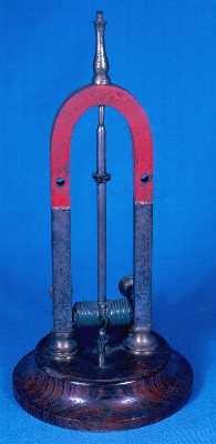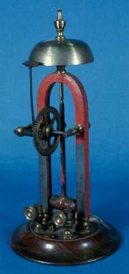 This was a popular piece of apparatus! I have seen three examples by Davis and one by another maker (the Wittenberg example at the left) in the fifty odd collections I have examined. The instrument is an inverted revolving electromagnet, with a gearing system added to strike the bell every hundred revolutions. The gearing also acted to keep down the rotation speed of the engine.