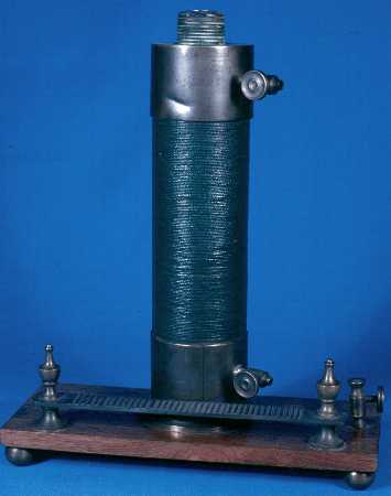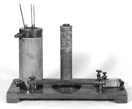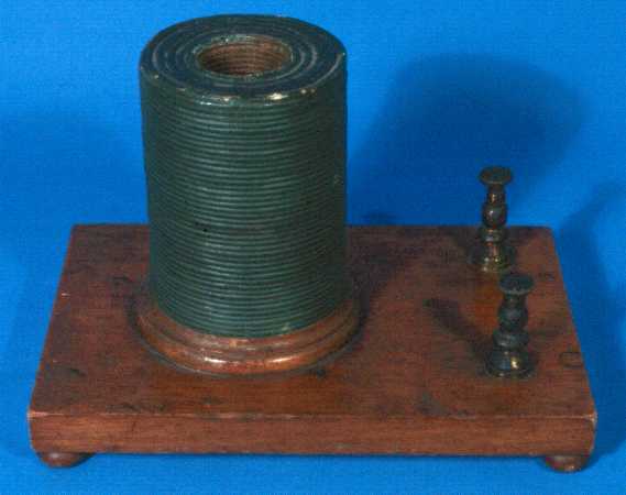 The inner helix has about 75 ft of coarse copper wire, while the outer helix is wound with one to three thousand feet of fine wire. The core of iron wires can be removed and replaced with a solid iron rod, resulting in a decrease in the intensity of the shocks produced by the instrument. |