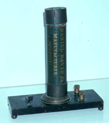 The base of this apparatus has been painted black. When the paint was removed, the wood appeared to have been sanded (the Davis varnish was high gloss, making adhesion difficult). However, the wood had the usual wild Davis grain, and the apparatus will soon be returned to its original finish. |